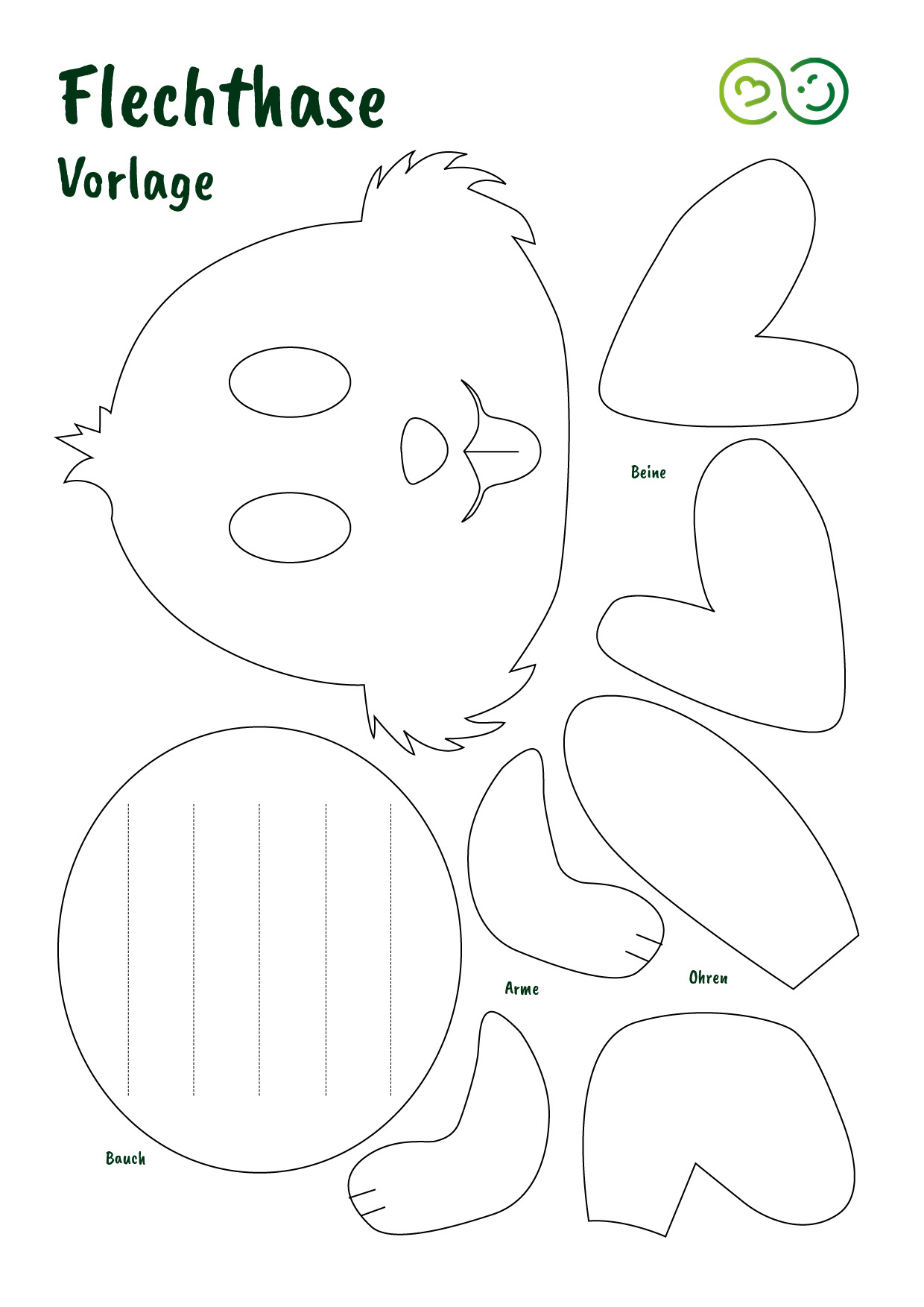 Drucke zuerst die Flechthasen-Vorlage aus. Nun können die Kinder den Hasen nach Lust und Laune ausmalen. Besonders schön wirken verschiedene Brauntöne, aber auch bunte Osterhasen sind natürlich erlaubt.
