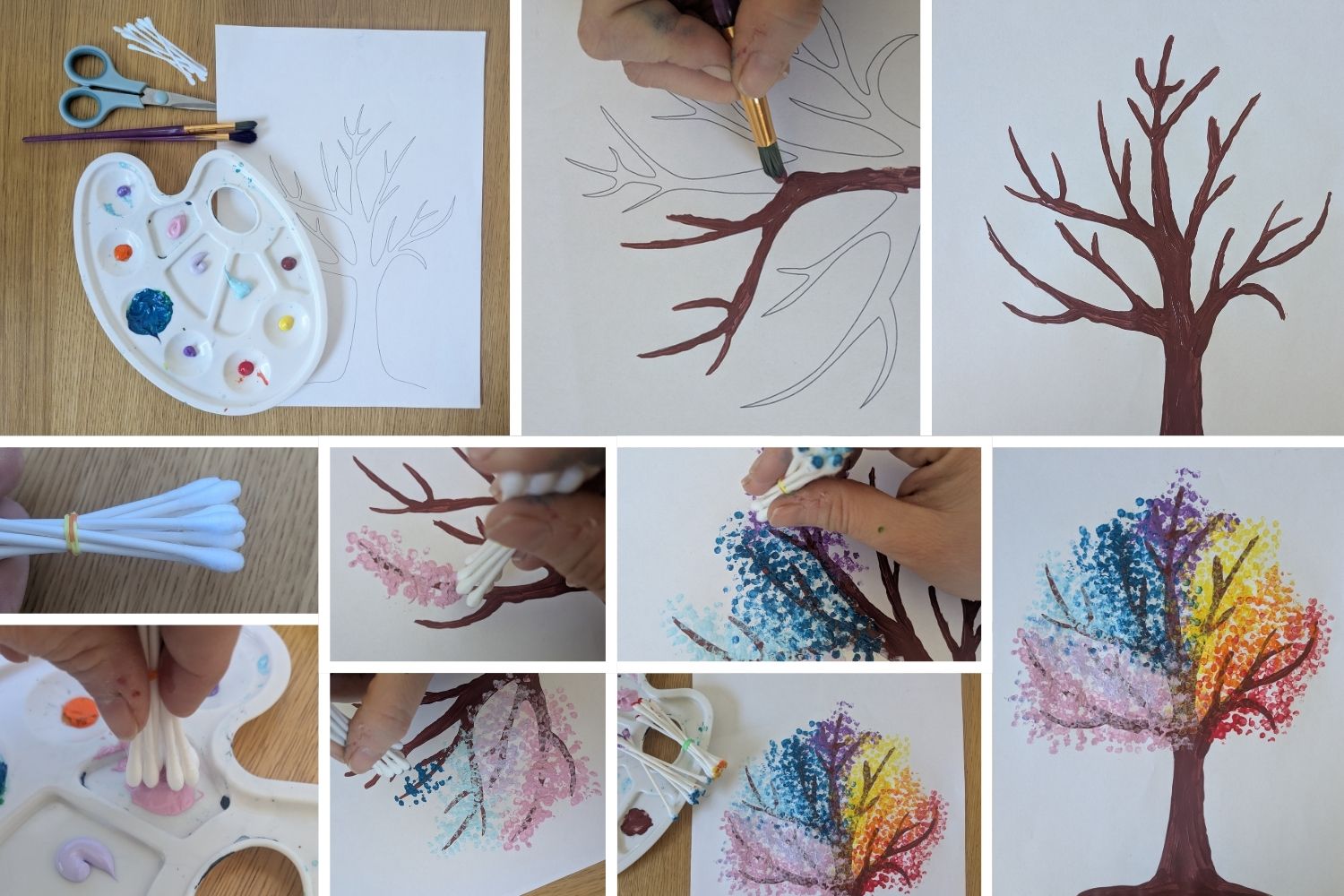 Alles, was ihr dafür braucht, sind ein paar Wattestäbchen, Farbe und unsere kostenlose Baum-Vorlage. Schnell vorbereitet, leicht umzusetzen und ideal für Kita, Vorschule und Grundschule.